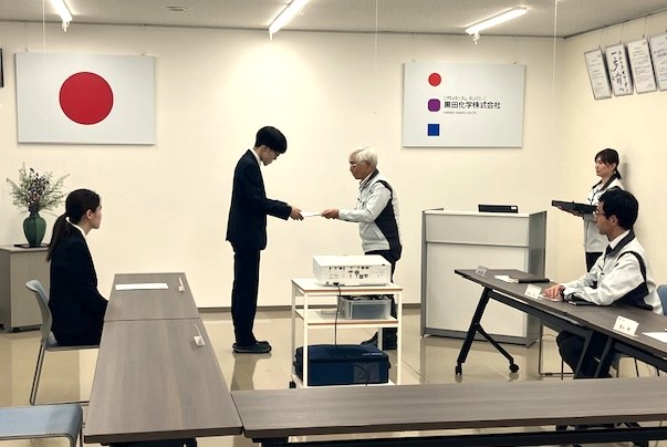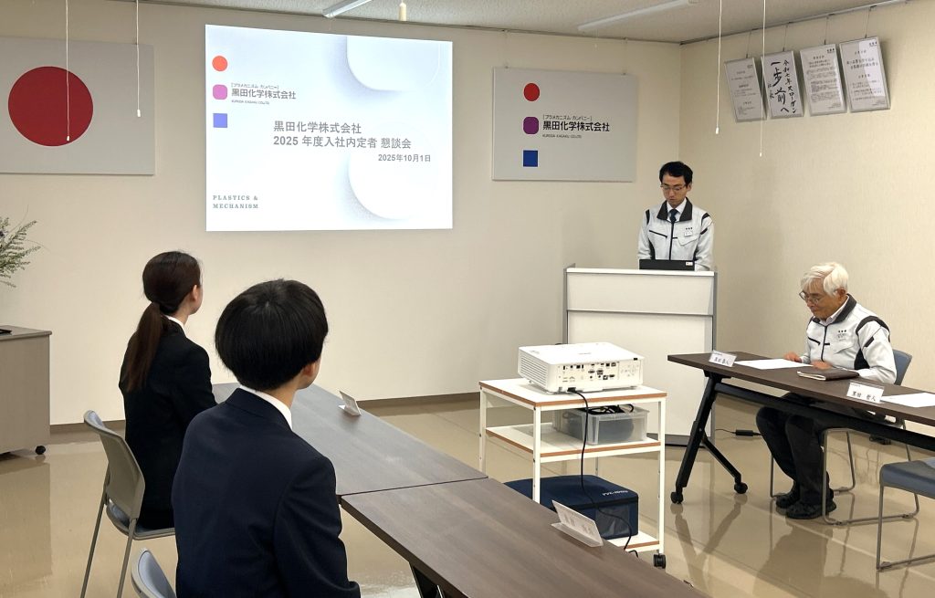 2025.10.03 2026年度入社予定者 内定者懇談会を開催しました 黒田化学株式会社では、10月1日、2026年度入社予定者の内定者懇談会を執り行いました。 社長から歓迎の挨拶と激励の言葉、副社長から会社の概要、目指すところを共有いたしました。 内定者の皆さんの緊張の中にも真剣な面持ちで耳を傾ける姿が印象的でした。 その後、一人ひとりが自己紹介や今後の抱負を述べ、和やかな雰囲気の中で交流を深めることができました。 内定者の皆さんが来春、黒田化学の新しい仲間として加わってくださることを、社員一同心より楽しみにしております。